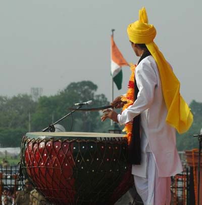 Beating Mutiny Drum: An artiste beating the "Nagara" drum at the commemorative celebration of the 150th anniversary of the first war of independence at Red Fort in Delhi on Friday.