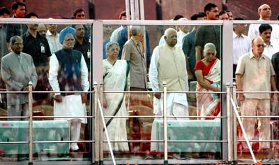 Dignitaries at Red Fort: President, A.P.J. Abdul Kalam, Prime Minister, Manmohan Singh, Speaker, Lok Sabha, Somnath Chatterjee and other dignitaries are at the inaugural function of the national celebrations to commemorate 150th anniversary of the First War of India s Independence at red fort, in Delhi on Friday.