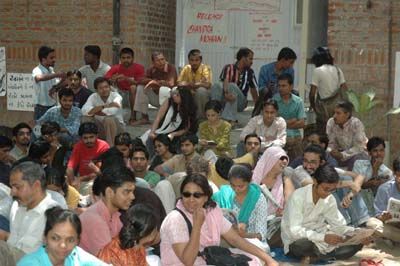 Artists protest: Fine Arts faculty students protest against the arrest of the handramohan, who has allegedly abused picture of the deities in the Fine Arts Faculty Exbition Hall at Vadodara on Sunday.