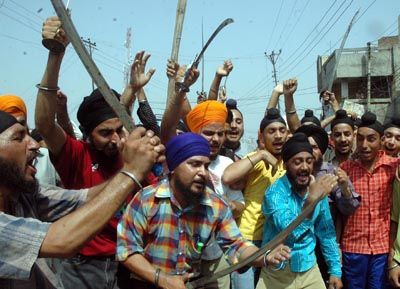 Up in Arms: Sikhs continuing their protest on Dera Sacha Sauda issue for the fourth day in Jammu on Friday.
