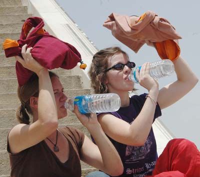 Beat the Heat: Foreign tourists quench their thirst at Jantar Mantar in Jaipur on a hot summer day on Thursday.