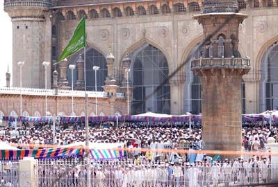 Prayers as usual: Thousands of muslims offered prayers in Mecca Masjid peacefully on Friday after one week of bomb blasts at Hyderabad.