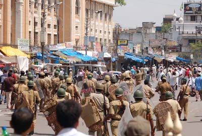 Mild Canning: Police dispersing the Muslim protesters by resorting to light canning near Mecca Masjid on Friday at Hyderabad.