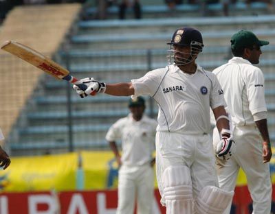 Tendulkars Ton: Sachin Tendulkar gestures after scoring his century during the second day of the second cricket Test match against Bangladesh in Dhaka May 26, 2007.