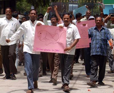 Fishy controversy: JANA VIGNANA VEDIAK activists protest against the Fish Medicine distribution by Batanni Brothers in Hyderabad on Sunday.