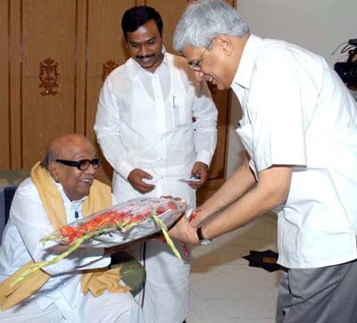 Karunanidhi at Tamil Nadu House, in New Delhi on Monday as Union Communication and