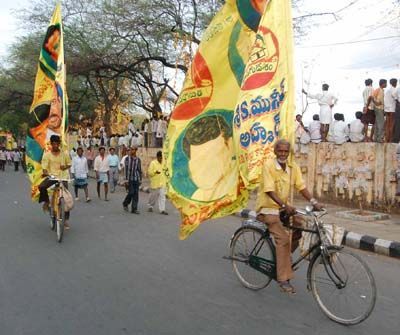 Staunch Loyalists: TDP followers show their loyality by displaying the party flag hoisted on their cycles are pedalling their way to reach SV College grounds, the public meeting venue TDPs Mahanadu held in Tirupati on Tuesday.