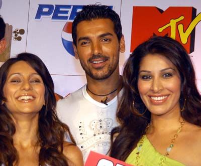 Youth Icons: Actor John Abraham alongwith MTV VJ s Anushka and Sophiya in the MTV youth icon at the Mtv studio in Mumbai.