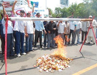 Burn the evil: NSUI activists burnt cigarate packets on the ocassion of World Anti-Tabacco Day in Hyderabad on Thursday.