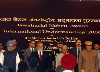 Jawaharlal Nehru Award: President APJ Abdul Kalam flanked by his Brazlian counterpart Luiz Inacio Lula Da
