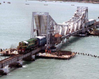 Bridge" is seen in the picture, when a passenger train is running over the Pamban