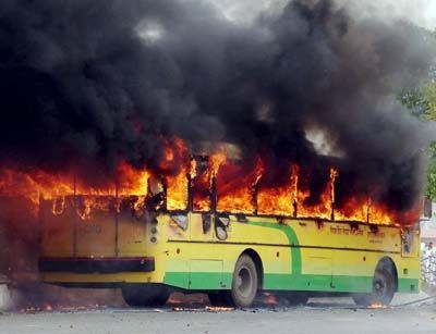 Gujjar fire rages: A local transport bus set on fire by the protesters from India s