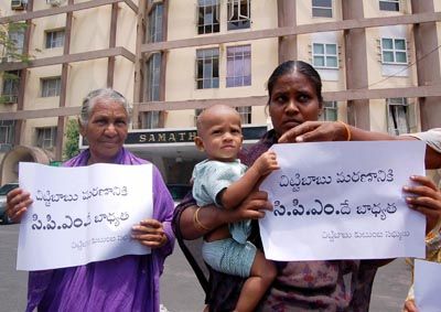 Land Victims: Families of victims who committed suicide stage a protest demanding justice and action against CPM on Monday at State Seretariate. A few farmers allegedly committed sucide as their lands were forcibly occupied by the CPM workers near Vijayawada.