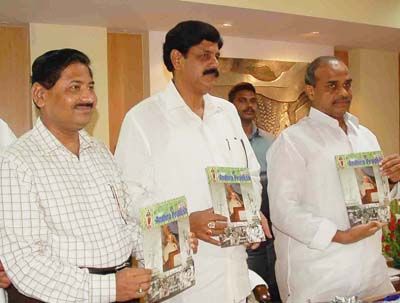 Andhrapradesh in English: Chief minister Y.S. Rajasehkar reddy releasing" Andhra Pradesh" the new english magazine published by the government of Andhra Pradesh at secretariat on Monday. I&PR Minister Aanam Narayana Reddy, Special Commissioner I & PR C. Parthasarathi are also seen in the picture.