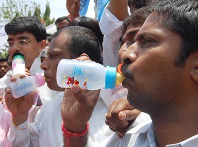 with milk feeding bottles ridiculing TRS president KCRs