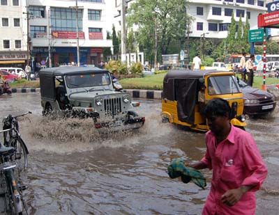 Wade through floods: Vehicles wading through flood water in Hyderabad.