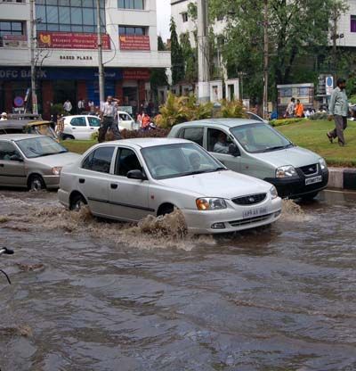 Rain hit traffic: Hyderabad City experienced sudden and heavy downpour on tuesday afternoon throwing the bustling traffic out of gear. Arterial roads in the city were submerged under the flood water bringing the traffic to a halt. However, the rains have brought relief to city residents as sultry weather has been making the life hell for over a week.