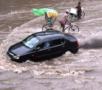 Negotiating flood water: A waterlogged street in Kolkata after heavy monsoon showers on Wednesday.