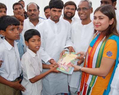 B day gifts: NSUI national general secretary Ragini Nayak giving away free books to poor students on occasion of Rahul Gandhi birth day celebrations in Hyderabad on Tuesday.