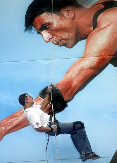 Dare Devil act: Bollywood actor Akshay Kumar abseils down a ninety feet tall building during a stunt show at Kolkata on Wednesday.