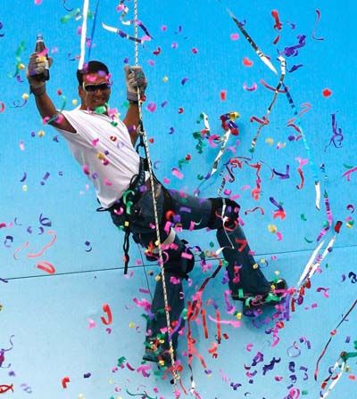 Bollywood actor Akshay Kumar abseils down a 90 feet (30 metre) tall building during a campaign for a soft drink company in the eastern Indian city of Kolkata June 20, 2007.