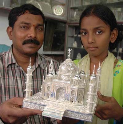Taj in Silver: Goldsmith Krishna Chari with a Taj Mahal made from 13 Kg of silver and measuring two feet in height in the campaign to vote for Taj Mahal as one of the new Seven Wonders of the World, in Hyderabad on Friday.