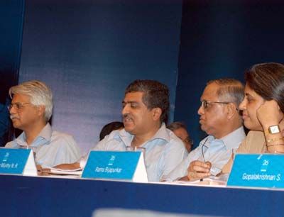 Infy AGM: Infosys Chief Mentor N R Narayan Murthy, Nandan Nilekani, CEO and MD, Deepak M Satwalekar Board Member and Rama