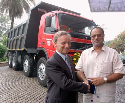 Volvo Trucks: Eric Leblanc, Managing Director, Volvo India Pvt Ltd., presenting Volvo Tipper Truck keys to V Prabhakar Reddy,