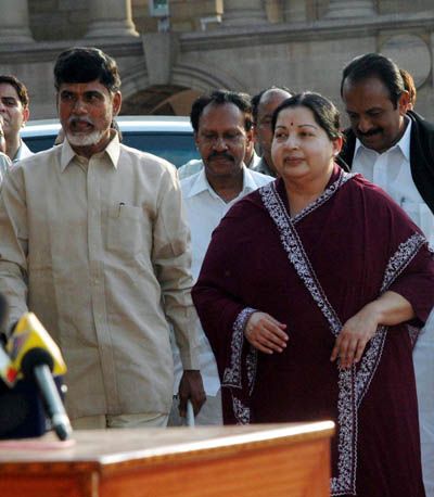 Lost the battle: UNPA leaders J Jayalalithaa, N Chandrababu Naidu and others coming out of the Rashtrapati Bhavan after meeting President APJ Abdul Kalam in New Delhi on Friday.