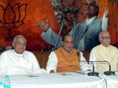 BJP Introspection: BJP President Rajnath Singh flanked by former prime Minister Atal Bihari Vajpayee and L K Advani at the party s office bearers meeting in New Delhi on Sunday.