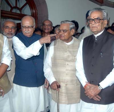 Head on with Pratibha: Veteran BJP leader L K Advani seems to be pointing out NDA Presidential candidate Bhairon Singh Shekhawat to Sushma Swaraj (extreme right) while accompanying him from the Returning Officer s room in Parliament House in New Delhi on Monday.