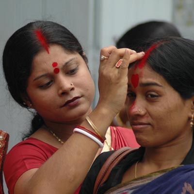 Auspicious Sindhur: Women applying “Sindur” on each others on the occasion of "Ambubachi mela" in Agartala on Monday.