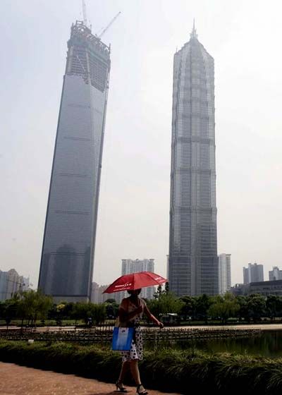 Worlds tallest towers: A woman walks through a park near the World Financial Centre (L) and the Jinmao Tower (R) in Shanghai, China, 27