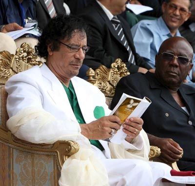 Gaddafi visit to Freetown: Libyan leader Muammar Gaddafi (L) is flanked by Sierra Leone s President Ahmad Tejan Kabbah in Freetown, Sierra