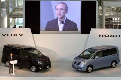 Toyotas Voxy and Noah: Toyota Motors Corp. President Katsuaki Watanabe presents the fully redesigned Voxy and Noah minivans at a press