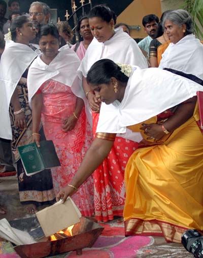 Sex Workers renunciation: Those who had been engaged in sex work taking an oath, after renouncing the profession, that they would campaign against trafficking an oath.Members of the Indian Community Welfare Organisation burnt personal diaries of pimps and sex workers that contained details of clients, sex workers and pimps after they decided to campaign against trafficking on the International Day against Drug abuse and Illegal trafficking in Chennai on Tuesday.