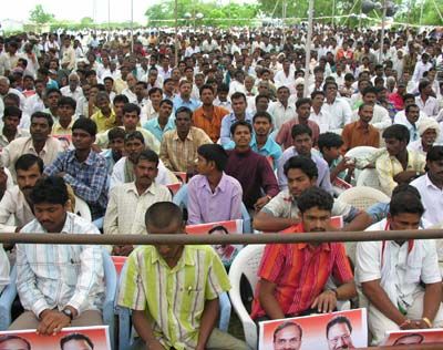 Men at public meeting: Chief Minister of AndhraPradesh YS Rajasekhara Reddy addressing the gathering at the launching ceremony of Telengana University in Dichipally of Nizambad District on Thursday