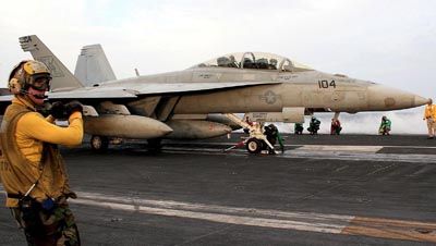 Ready to take off: Aircraft Handling Officers signaling to launch a F18 Hornet fighter aircraft onboard of USS Nimitz about 10