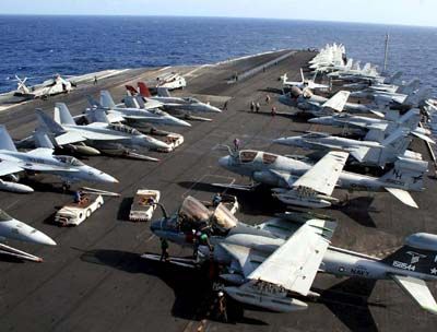 Birds eye view of Nimitz: F18 Super Hornet and Hornet fighter aircrafts onboard of USS Nimitz about 10 nautical miles off coast of Chennai,