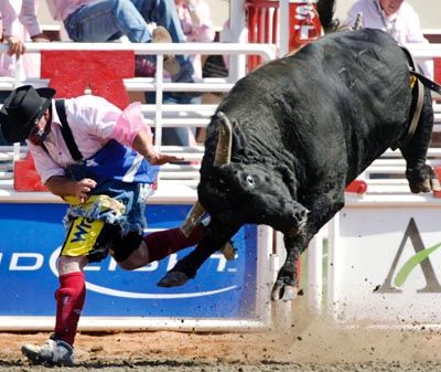 Danger in the air : Bullfighter Dave Sandilans runs from the bull Fool U during the Bullriding event during day one of the Calgary Stampede in Calgary, Alberta, July 6, 2007.