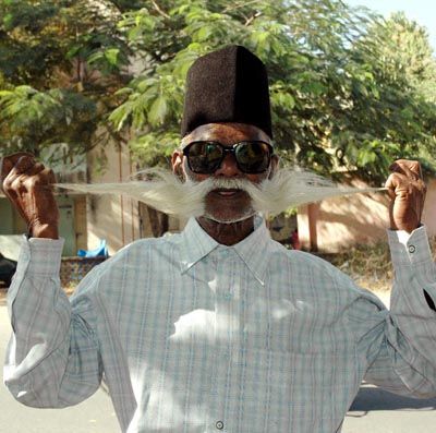 Pull wide open: Octogenarian Ponniah, proudly sports a two feet long moustache in Madurai on Saturday. He says he has been maintaining his whiskers for decades.