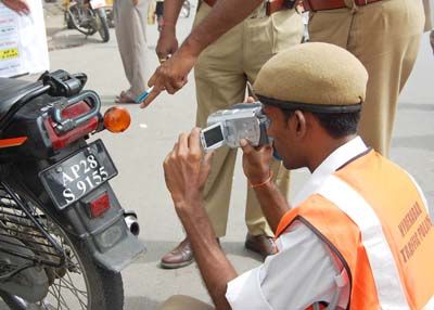Fun and Fancy, No more!: A traffic cop tries to capture funny number plate vehicle in video camera as the Hyderabad Traffic Police