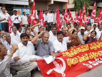 Bring down the prices: CPI activists staged rasta roko at Civil Supplies Bhavan demanding to decrease hiked essential commodities prices in Hyderabad on Wednesday.
