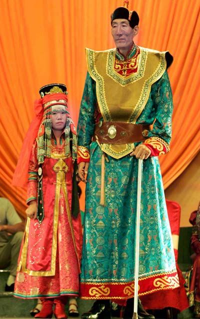 Tall Wedding: Bao Xishun (R), 56, a 2.36-metre (7 feet, 9 inches) herdsman listed by the Guinness World Records as the tallest living man, and his bride Xia Shujuan, 29, 1.68 metres (5 feet, 5 inches), stand during their wedding ceremony on the outskirts of Erdos in north China s Inner Mongolia Autonomous Region July 12, 2007. The world s tallest man, whose search for a bride covered the world, ended up marrying a woman from his home town nearly half his age and more than two feet shorter, Chinese media reported.