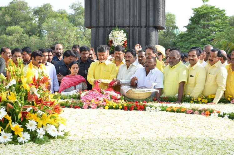 TDP president and Andhra Pradesh Chief Minister Nara Chandrababu Naidu, NTR son Nandamuri Balakrishna and other TDP leaders paying tributes to TDP founder and former Chief Minister N T Rama Rao on his birthday at NTR Ghat in Hyderaba on 28th May 2015.