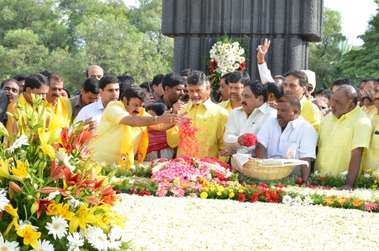 TDP president and Andhra Pradesh Chief Minister Nara Chandrababu Naidu, NTR son Nandamuri Balakrishna and other TDP leaders paying tributes to TDP founder and former Chief Minister N T Rama Rao on his birthday at NTR Ghat in Hyderaba on 28th May 2015.