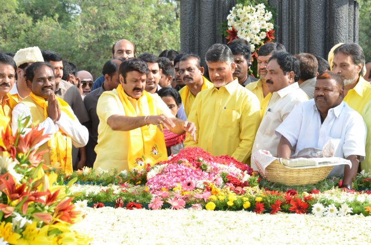 TDP president and Andhra Pradesh Chief Minister Nara Chandrababu Naidu, NTR son Nandamuri Balakrishna and other TDP leaders paying tributes to TDP founder and former Chief Minister N T Rama Rao on his birthday at NTR Ghat in Hyderaba on 28th May 2015.