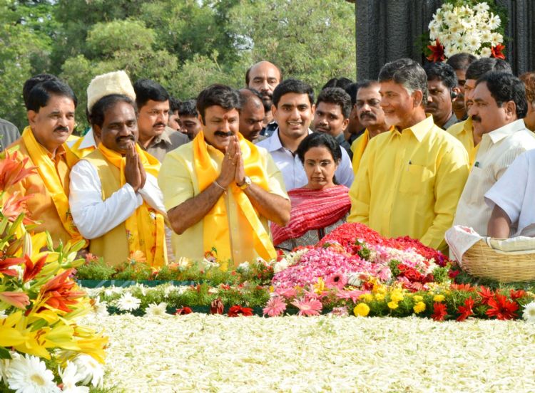 TDP president and Andhra Pradesh Chief Minister Nara Chandrababu Naidu, NTR son Nandamuri Balakrishna and other TDP leaders paying tributes to TDP founder and former Chief Minister N T Rama Rao on his birthday at NTR Ghat in Hyderaba on 28th May 2015.