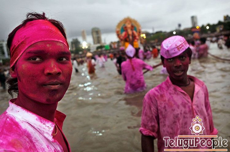 Indian Hindu devotees covered in paint stand in front of a large statue of the elephant-headed Hindu God Ganesh, seen in the background, before immersing it in the Arabian Sea, on the final day of the festival of Ganesh Chaturthi in Mumbai, India, Thursday, Sept. 3, 2009.