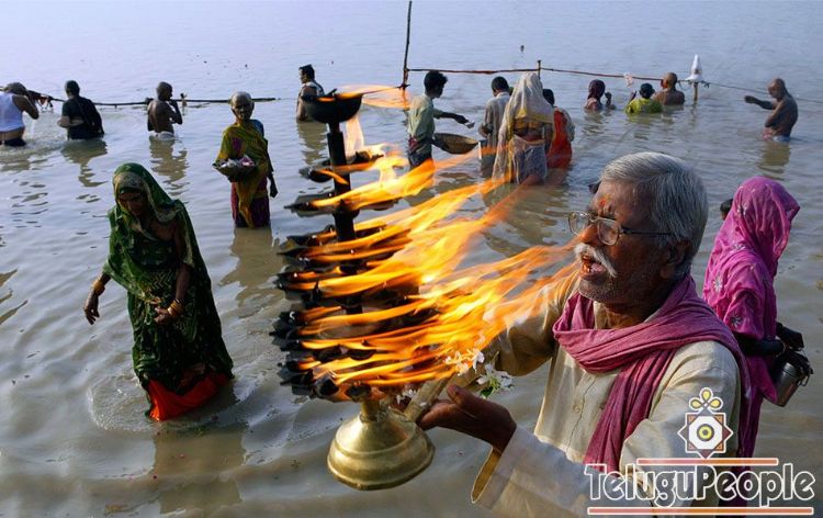 A Hindu priest performs morning rituals with a traditional oil lamp on the banks of the River Ganges in Allahabad, India, Wednesday, Sept. 2, 2009.